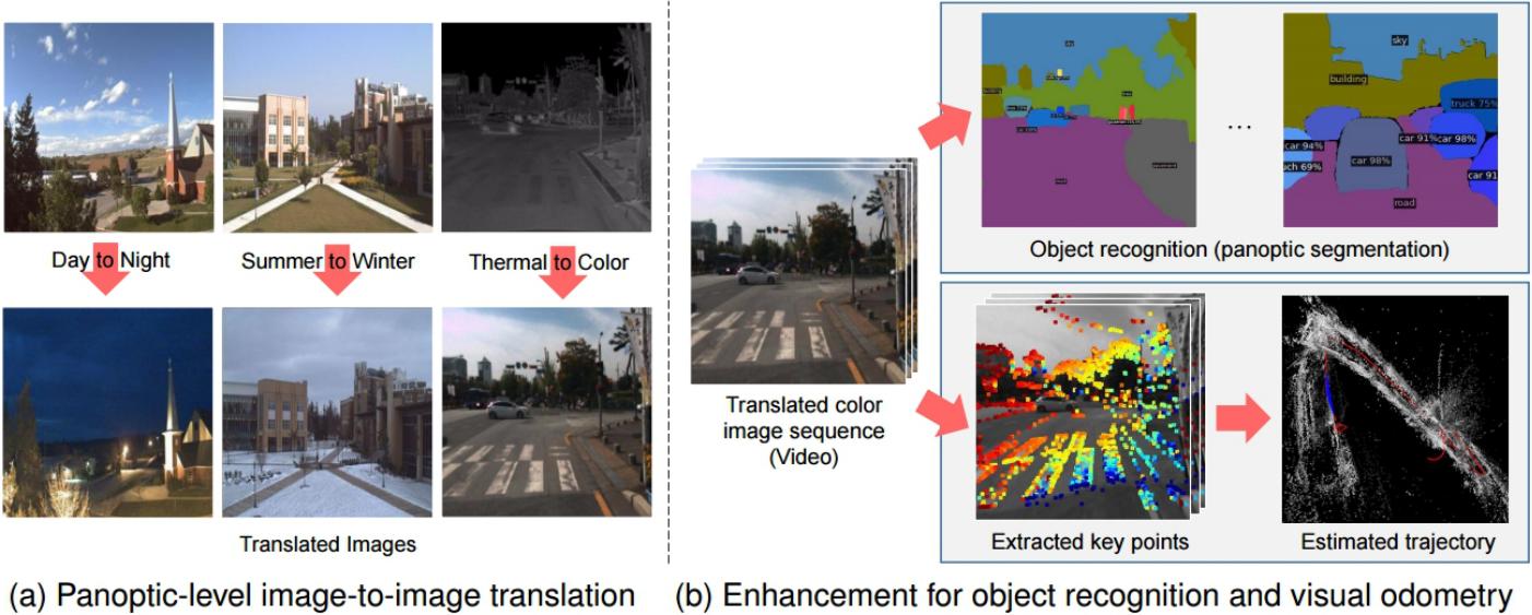 Panoptic-Level Image-to-Image Translation for Object Recognition and Visual Odometry Enhancement